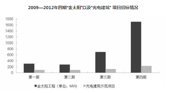 2009年之前,我國(guó)整個(gè)光伏行業(yè)處于初期示范階段。2009年,中國(guó)政府出臺(tái)“金太陽(yáng)工程”和“光電建筑應(yīng)用示范項(xiàng)目”特許權(quán)招標(biāo)政策,緊急啟動(dòng)國(guó)內(nèi)光伏發(fā)電市場(chǎng)。當(dāng)年3月,由國(guó)家財(cái)政每年出資約100億元,為太陽(yáng)能屋頂和光伏建筑建設(shè)提供補(bǔ)貼。