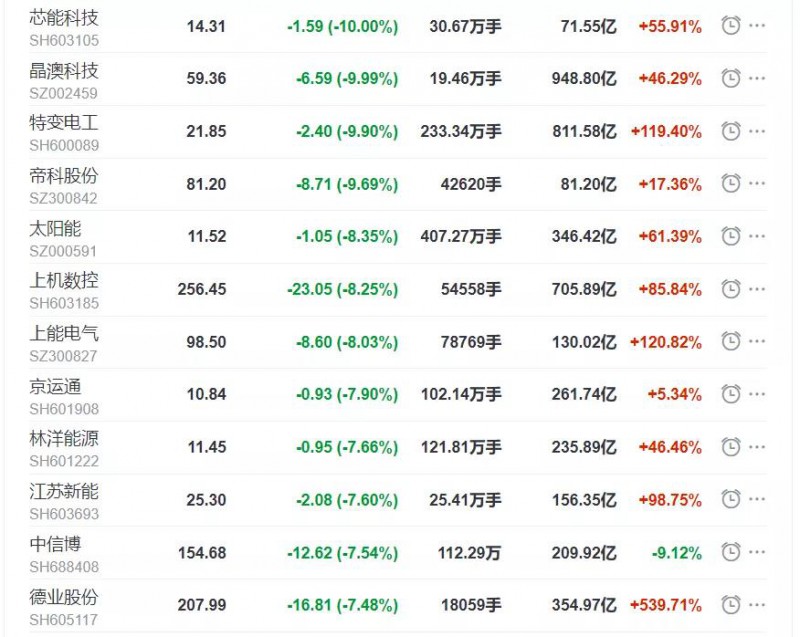 國慶假期后的第一個交易日,光伏板塊高開后一路下跌,截至收盤,光伏產(chǎn)業(yè)指數(shù)(東財(cái))下跌2.8%,50支成分股僅有14家上漲,而跌幅超過5%的個股達(dá)到15家。其中,芯能科技和晶澳科技跌停,特變電工、太陽能盤中一度封死跌停。