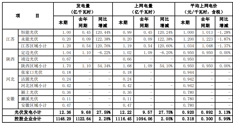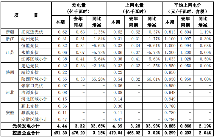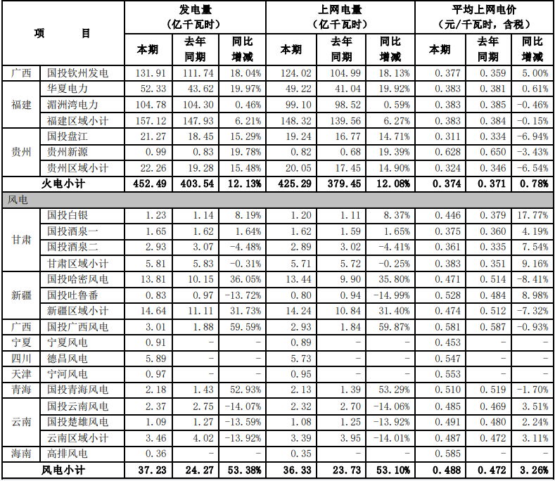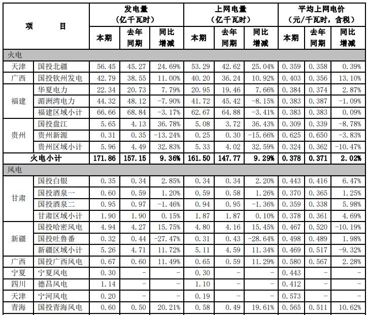 根據(jù)國投電力控股股份有限公司(以下簡(jiǎn)稱公司)境內(nèi)控股企業(yè)初步統(tǒng)計(jì), 2021年 7-9 月,公司境內(nèi)控股企業(yè)累計(jì)完成發(fā)電量491.30 億千瓦時(shí),上網(wǎng)電量479.04 億千瓦時(shí),與去年同期相比分別增加3.15%和3.02%。2021年1-9月,公司境內(nèi)控股企業(yè)累計(jì)完成發(fā)電量1148.29億千瓦時(shí),上網(wǎng)電量1116.45億千瓦時(shí), 與去年同期相比分別增加 2.28%和2.05%。 2021年7-9 月,公司境內(nèi)控股企業(yè)平均上網(wǎng)電價(jià)0.299 元/千瓦時(shí),與去年同期相比增加了 2.04%。