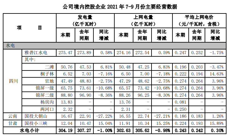 2021年1-9月,公司境內(nèi)控股企業(yè)平均上網(wǎng)電價(jià) 0.318元/ 千瓦時(shí),與去年同期相比增加了5.99%。