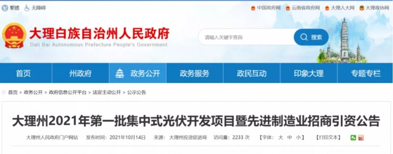 大理州2021年第一批集中式光伏開發(fā)項(xiàng)目暨先進(jìn)制造業(yè)招商引資公告