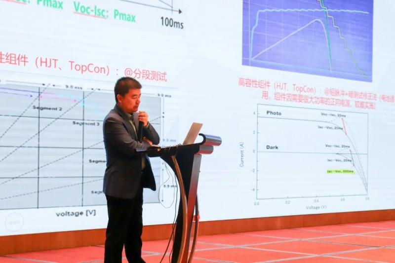 北京德雷射科光電有限公司總經(jīng)理林慧軍,作了《高容性太陽電池組件I-V測(cè)試最新研究》的報(bào)告,分析了當(dāng)前高容性太陽電池組件I-V測(cè)試的現(xiàn)狀,然后針對(duì)光伏產(chǎn)品“容性高,測(cè)不準(zhǔn)”的行業(yè)痛點(diǎn),展示了該公司所做的技術(shù)工作及取得的重大成果。
