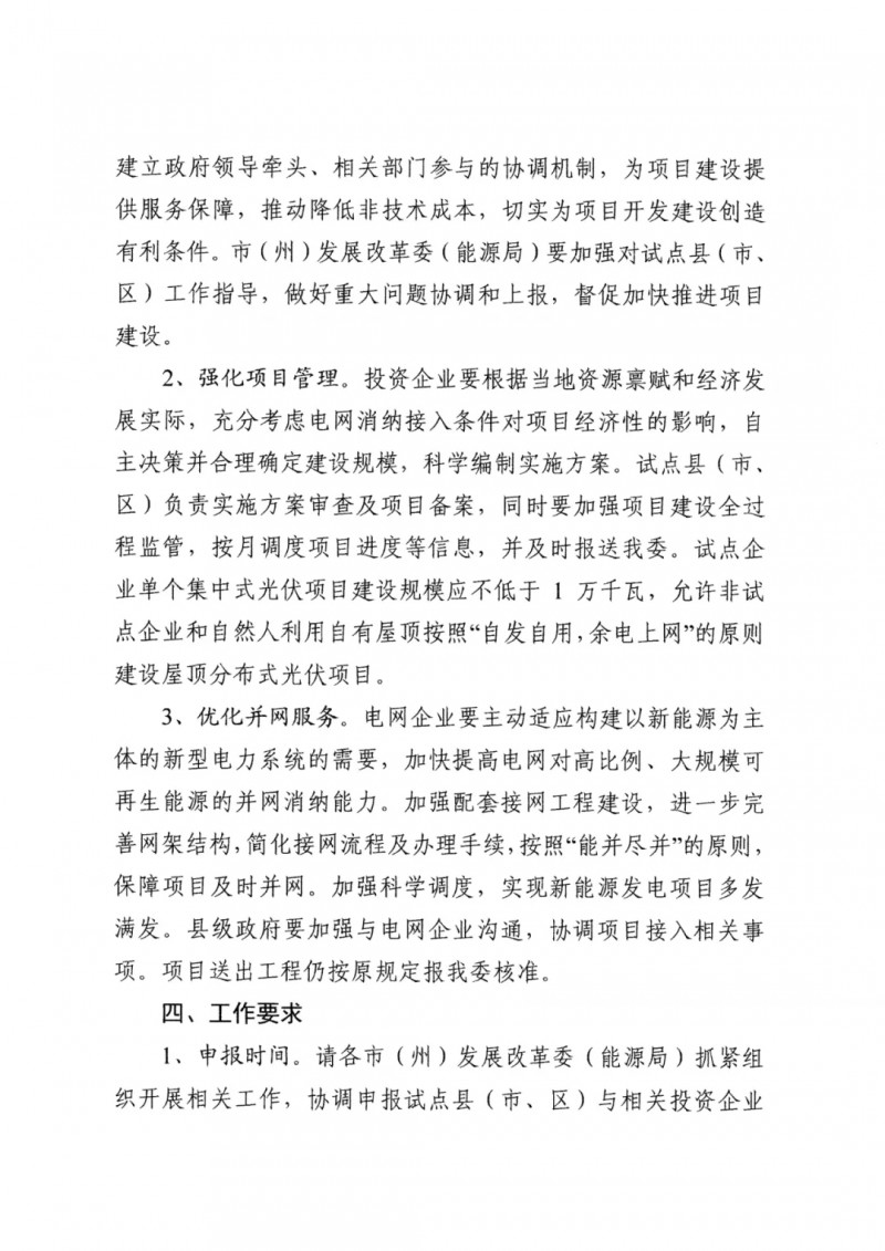 已納入國家試點的12個整縣屋頂分布式光伏試點縣,如縣(市、區(qū))政府和原開發(fā)企業(yè)按要求達成合作并按時上報相關材料的,可將試點范圍擴大至含地面分布式和集中式在內(nèi)的全部光伏項目,一并納入試點范圍。