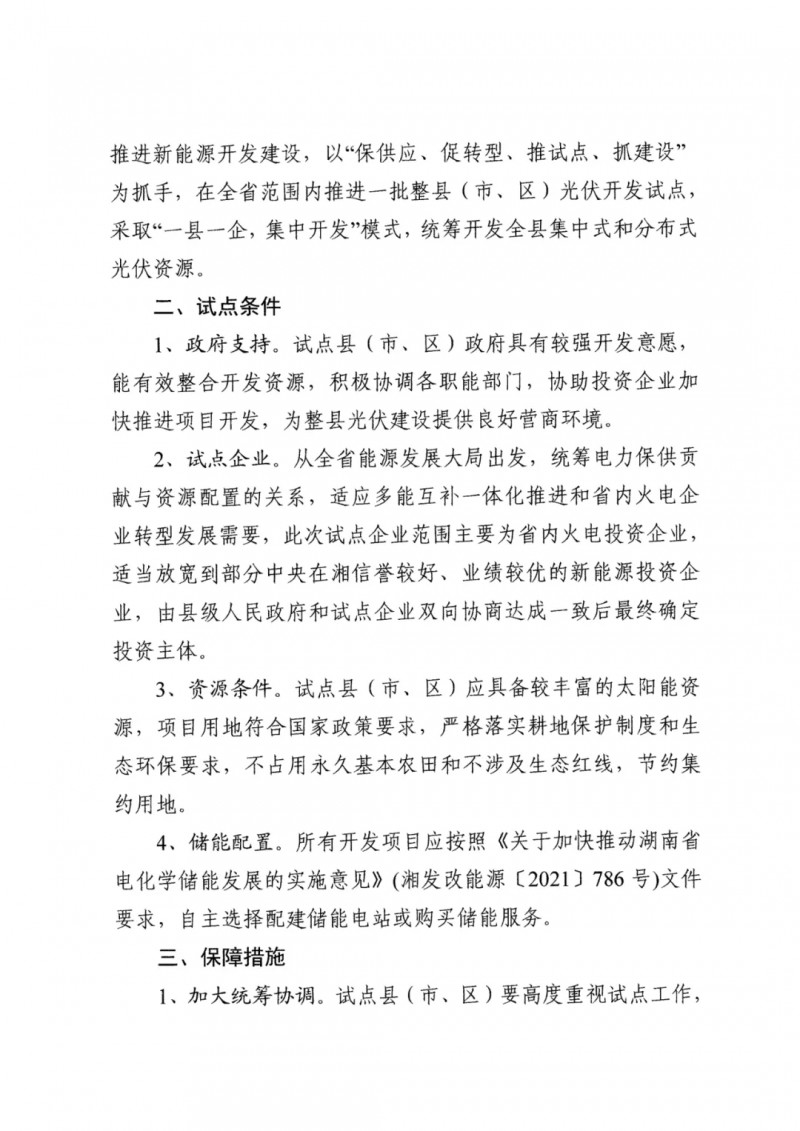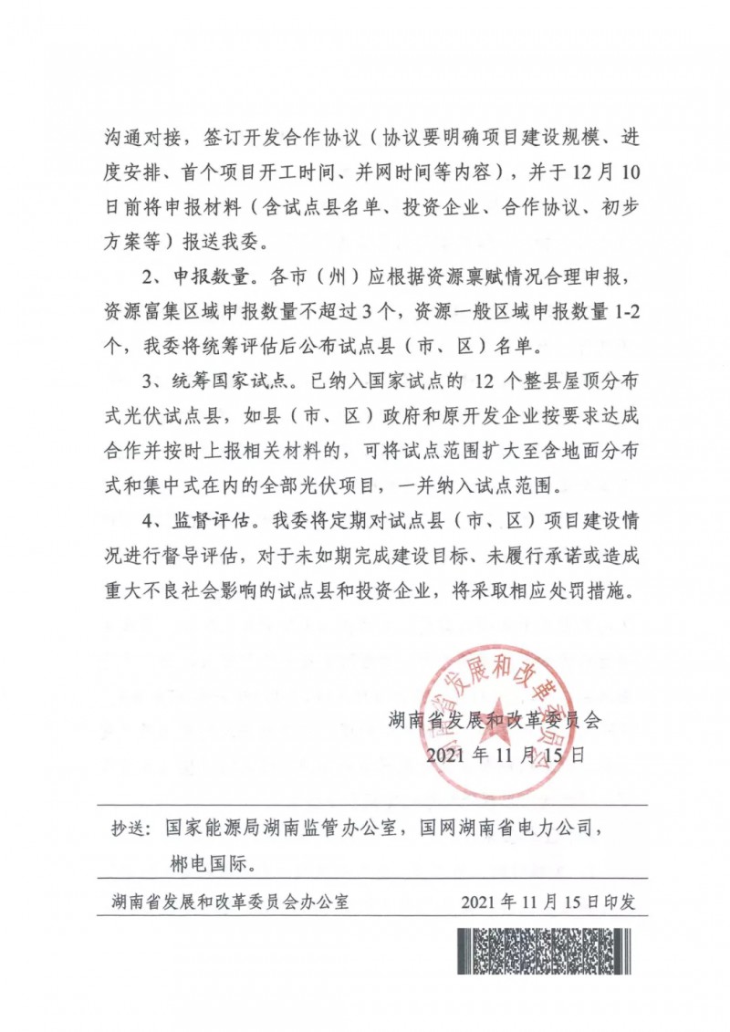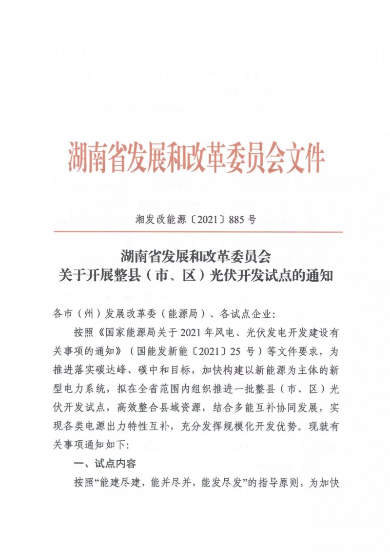 11月15日,湖南省發(fā)改委下發(fā)《關于開展整縣(市、區(qū))光伏開發(fā)試點的通知》,擬在全省范圍內(nèi)組織推進一批整縣(市、區(qū))光伏開發(fā)試點,高效整合縣域資源,結合多能互補協(xié)同發(fā)展。