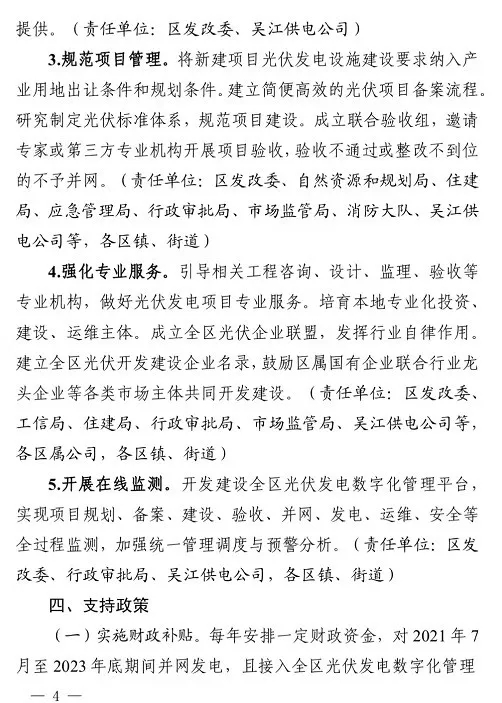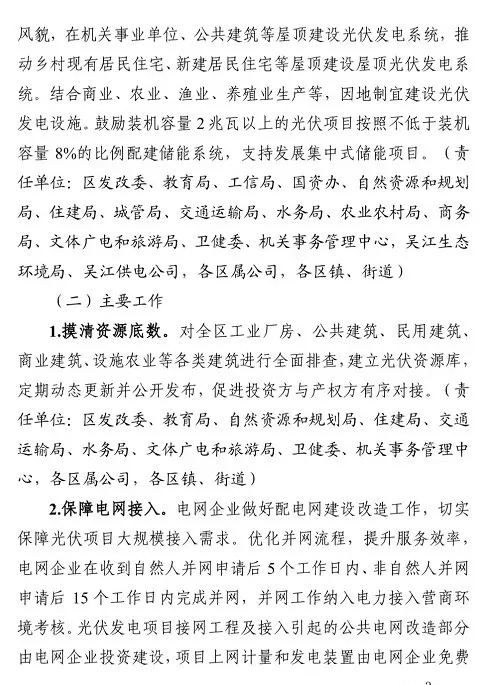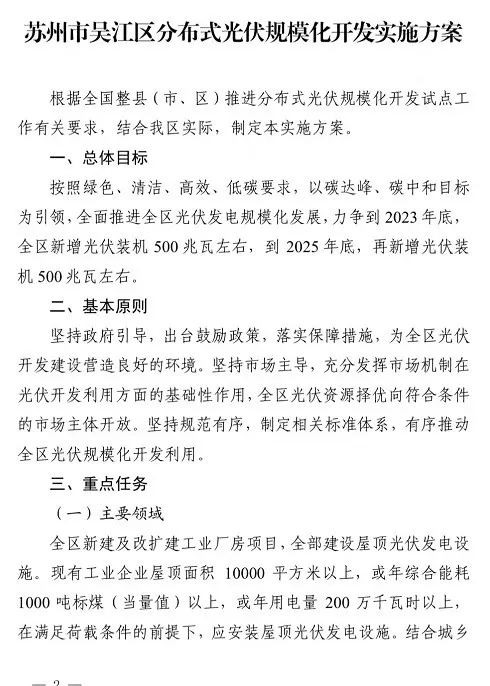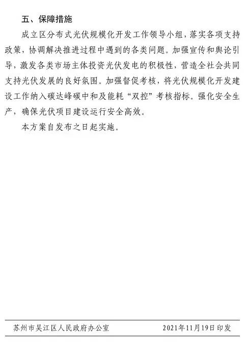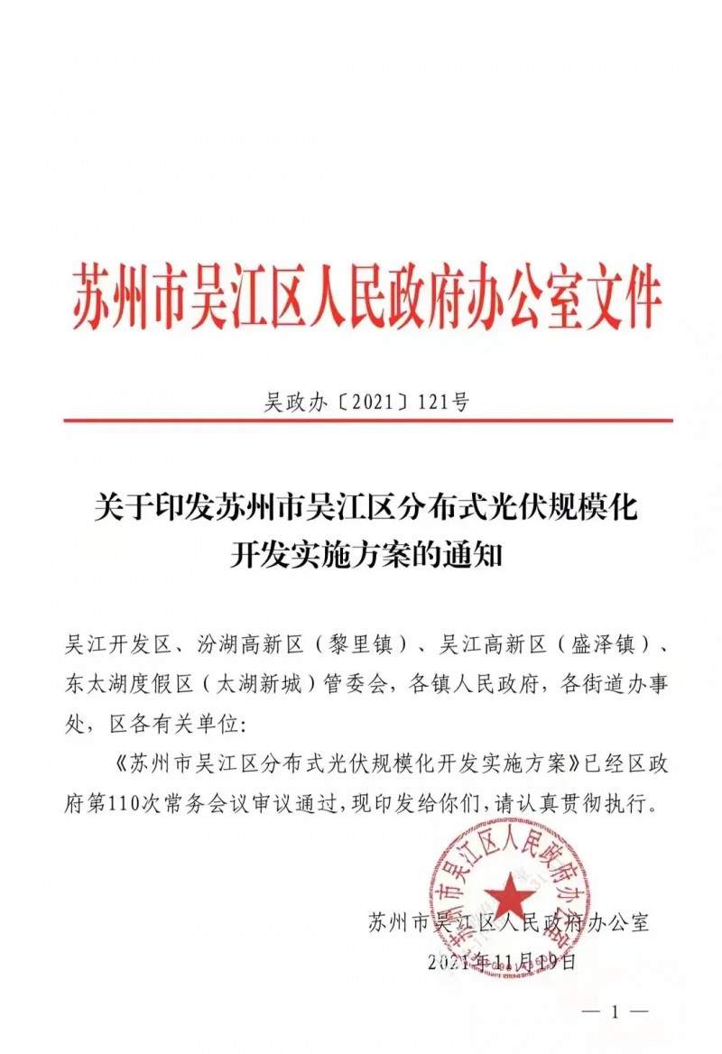 蘇州市吳江區(qū)人民政府發(fā)布印發(fā)吳江區(qū)分布式光伏規(guī)?;_發(fā)實施方案的通知。