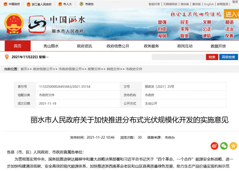 為貫徹落實(shí)黨中央、國(guó)務(wù)院推進(jìn)碳達(dá)峰碳中和重大戰(zhàn)略決策部署和習(xí)近平總書(shū)記關(guān)于“四個(gè)革命、一個(gè)合作”能源安全新戰(zhàn)略,進(jìn)一步加快構(gòu)建清潔低碳、安全高效的現(xiàn)代能源體系,加快推進(jìn)浙西南革命老區(qū)和山區(qū)縣高質(zhì)量綠色發(fā)展,助力生態(tài)產(chǎn)品價(jià)值實(shí)現(xiàn)機(jī)制示范區(qū)、城鄉(xiāng)共同富裕先行區(qū)建設(shè),根據(jù)國(guó)家和浙江省關(guān)于加快光伏應(yīng)用發(fā)展有關(guān)要求和整縣(市、區(qū))推進(jìn)分布式光伏規(guī)?;_(kāi)發(fā)試點(diǎn)工作部署,現(xiàn)就推動(dòng)我市分布式光伏規(guī)?;_(kāi)發(fā)提出如下意見(jiàn)。
