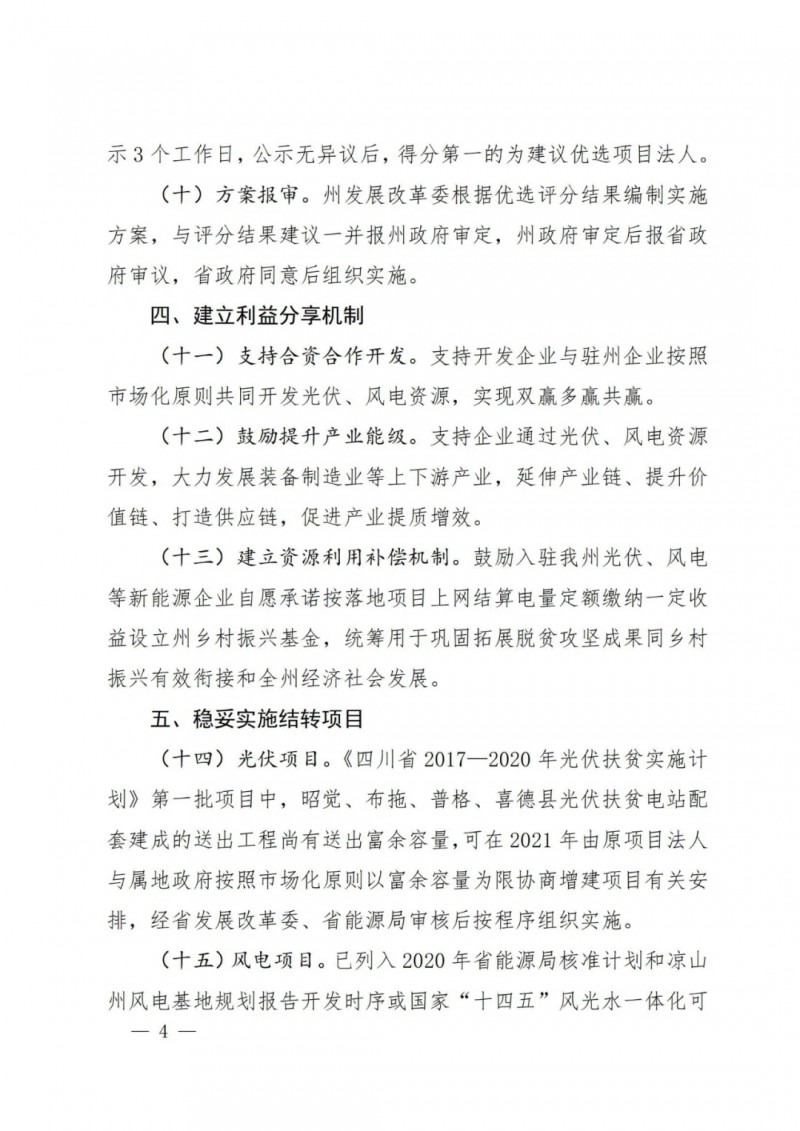 光伏項(xiàng)目?!端拇ㄊ?017—2020 年光伏扶貧實(shí)施計(jì) 劃》第一批項(xiàng)目中,昭覺(jué)、布拖、普格、喜德縣光伏扶貧電站配 套建成的送出工程尚有送出富余容量,可在2021 年由原項(xiàng)目法人 與屬地政府按照市場(chǎng)化原則以富余容量為限協(xié)商增建項(xiàng)目有關(guān)安 排,經(jīng)省發(fā)展改革委、省能源局審核后按程序組織實(shí)施。