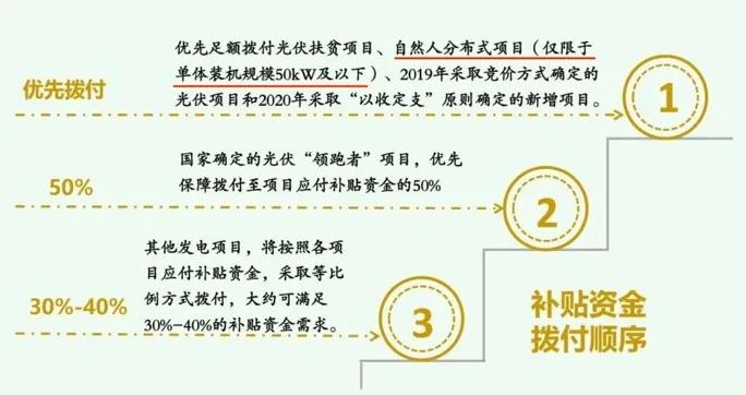 二、電網(wǎng)企業(yè)應(yīng)嚴(yán)格按照《資金管理辦法》,將補(bǔ)貼資金撥付至已納入可再生能源發(fā)電補(bǔ)助項(xiàng)目清單范圍的發(fā)電項(xiàng)目。在撥付補(bǔ)貼資金時(shí),應(yīng)優(yōu)先足額撥付國家光伏扶貧項(xiàng)目、50kW及以下裝機(jī)規(guī)模的自然人分布式項(xiàng)目至2022年底;優(yōu)先足額撥付公共可再生能源獨(dú)立系統(tǒng)項(xiàng)目至2021年底;優(yōu)先足額撥付2019年采取競價(jià)方式確定的光伏項(xiàng)目、2020年起采取“以收定支”原則確定的符合撥款條件的新增項(xiàng)目至2021年底;對于國家確定的光伏“領(lǐng)跑者”項(xiàng)目和地方參照中央政策建設(shè)的村級光伏扶貧電站,優(yōu)先保障撥付項(xiàng)目至2021年底應(yīng)付補(bǔ)貼資金的50%;對于其他發(fā)電項(xiàng)目,按照各項(xiàng)目至2021年底應(yīng)付補(bǔ)貼資金,采取等比例方式撥付。