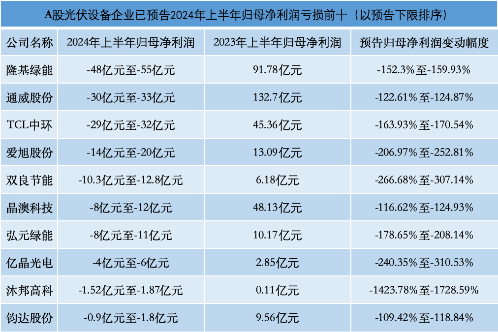 iFinD數(shù)據(jù)顯示,截至7月16日,在申銀萬國光伏設備行業(yè)分類的64家上市公司中,已有22家預披露了2024年上半年業(yè)績。其中,9家企業(yè)實現(xiàn)盈利,占比不足五成;18家企業(yè)歸母凈利潤同比下滑,占比超過八成。值得注意的是,在虧損前十的榜單中,包括通威股份、隆基綠能、TCL中環(huán)等在內(nèi)的頭部企業(yè)占據(jù)多數(shù)。