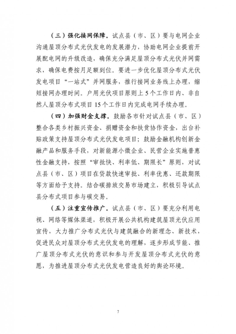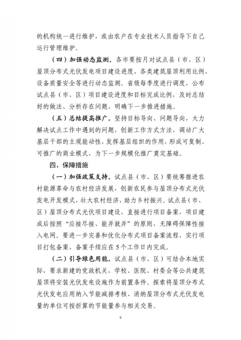 為促進(jìn)我省整縣屋頂分布式光伏項(xiàng)目建設(shè),省級(jí)將建立按月調(diào)度機(jī)制,對(duì)試點(diǎn)地區(qū)各類屋頂分布式光伏發(fā)電項(xiàng)目備案、開工、建設(shè)和并網(wǎng)情況等進(jìn)行全過程監(jiān)測(cè),按季度公布相關(guān)信息。非試點(diǎn)縣(市、區(qū))要按既有相關(guān)政策規(guī)定繼續(xù)開展各類屋頂分布式光伏發(fā)電項(xiàng)目開發(fā)建設(shè)。2023年底前,試點(diǎn)縣(市、區(qū))各類屋頂安裝光伏發(fā)電的比例均達(dá)到國家相關(guān)要求的,我委將申請(qǐng)列為國家整縣(市、區(qū))屋頂分布式光伏開發(fā)示范縣。試點(diǎn)中發(fā)現(xiàn)的亮點(diǎn)和存在的突出問題,請(qǐng)及時(shí)報(bào)送我委。