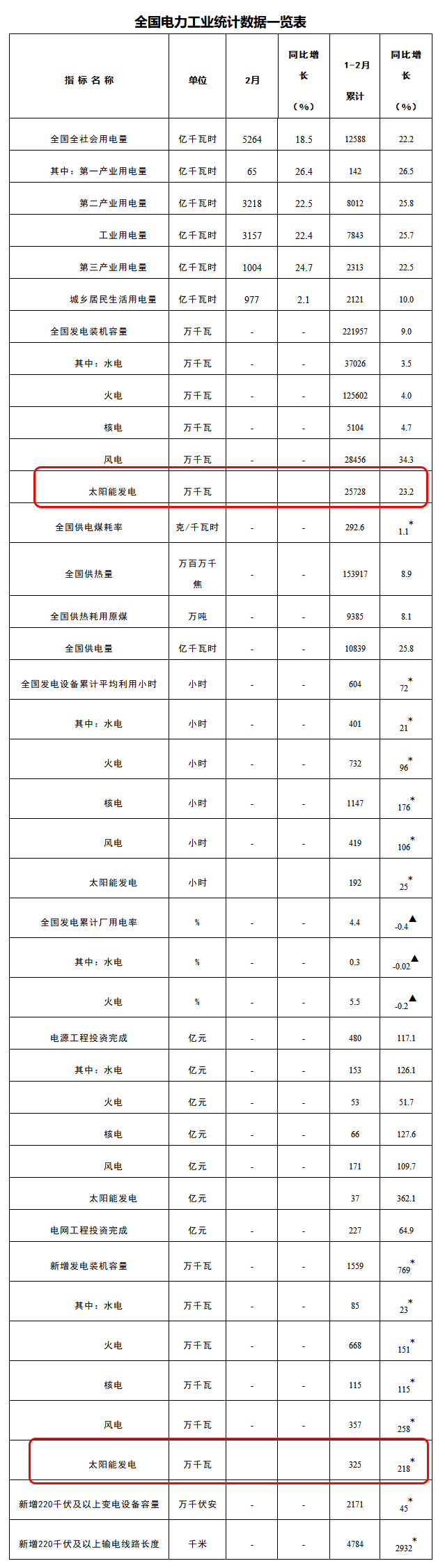今年1-2月份,全國(guó)全社會(huì)用電量為12588億千瓦時(shí),同比增長(zhǎng)22.2%。全國(guó)發(fā)電裝機(jī)容量為221957萬千瓦,同比上漲9%;其中太陽能發(fā)電裝機(jī)容量25728萬千瓦,同比增長(zhǎng)23.2%。