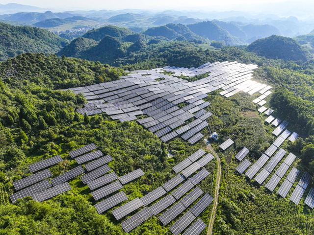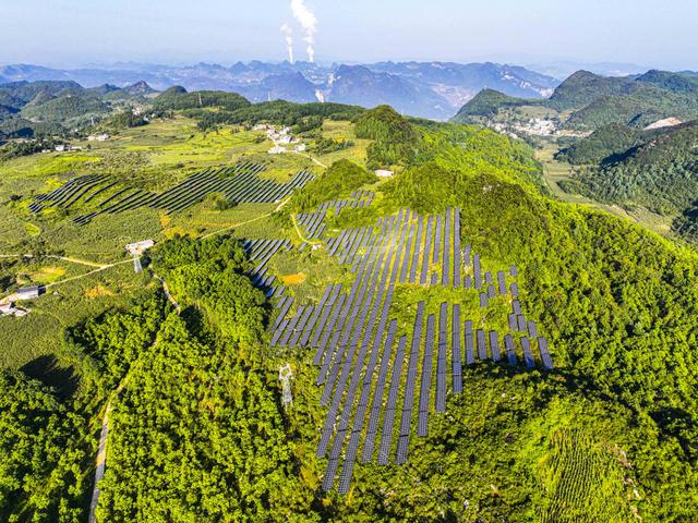 8月14日,黔西市五里布依族苗族鄉(xiāng)石門(mén)村,一塊塊藍(lán)色光伏板與村莊、道路、青山遙相呼應(yīng),共繪出一幅和美鄉(xiāng)村生態(tài)畫(huà)卷。