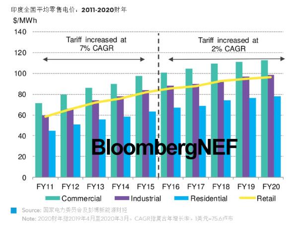 印度的商業(yè)電價(jià)是各類電價(jià)中最高的, 商業(yè)電價(jià)平均達(dá)112美元/兆瓦時(shí),比居民電價(jià)和工業(yè)電價(jià)分別高44%和14%。