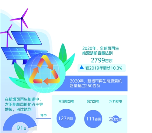 總部位于阿聯(lián)酋首都阿布扎比的國(guó)際可再生能源署(IRENA)近日發(fā)布報(bào)告《可再生能源裝機(jī)容量數(shù)據(jù)2021》。報(bào)告稱,2020年,全球可再生能源裝機(jī)容量達(dá)到2799吉瓦,較2019年增長(zhǎng)10.3%;新增可再生能源裝機(jī)容量超過260吉瓦。