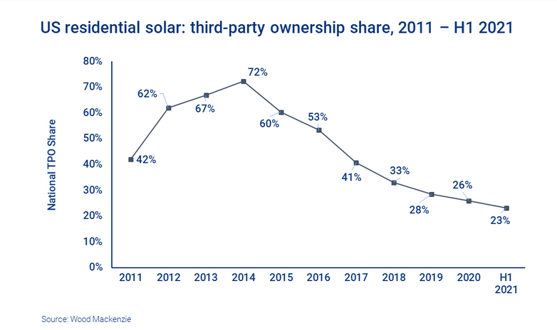近年來,光伏行業(yè)貸款的增長顯著超過了整體戶用光伏市場的增長。這導(dǎo)致第三方所有權(quán)(TPO)的新項(xiàng)目份額下降。事實(shí)上,TPO份額已從2020年的26%下降到2021年上半年的23%,這是有記錄以來的最低水平。與此同時(shí),貸款份額在同一時(shí)期從55%增加到60%。低利率的長期貸款(25年期,利率為3%或更低)繼續(xù)為客戶提供資金支持,并推動(dòng)市場增長。