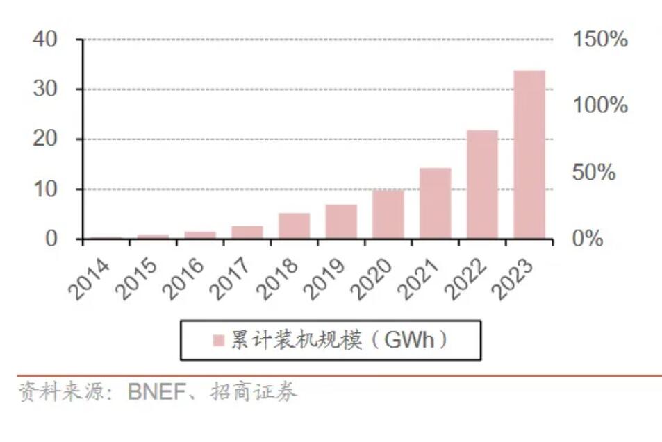 圖:2014-2023全球戶儲累計裝機(jī)規(guī)模(GWh)