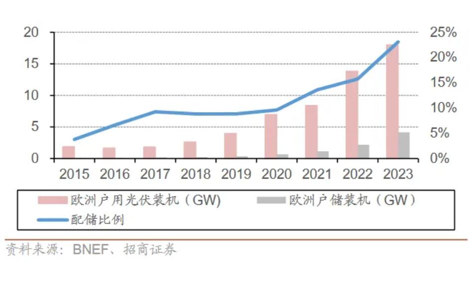 圖:歐洲戶用光儲裝機(jī)及配儲比例