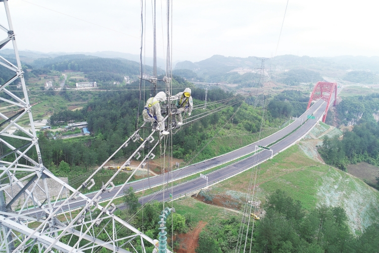 在云貴交界的北盤江大峽谷之上,國內(nèi)首個(gè)將兩端直流改造為三端直流的工程——云貴互聯(lián)通道工程與世界第一高橋北盤江大橋交相輝映。