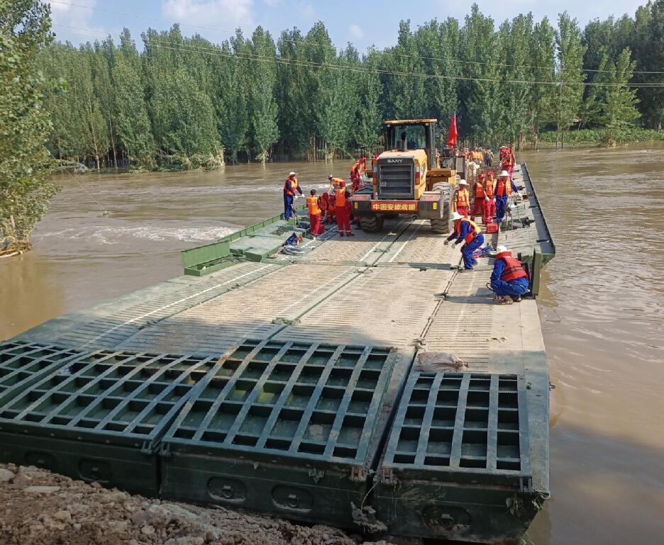 為了解決這個問題,安能三局用昨日在新鄉(xiāng)轉移被困群眾的應急動力舟橋,運輸挖掘機、推土機等大型裝備以及鋼筋籠和沙袋至決口右岸,今天又再一次立下大功。