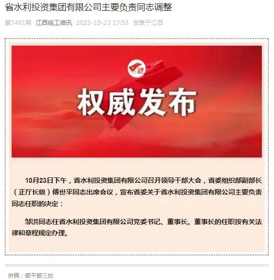 鄒洪同志任江西省水利投資集團有限公司黨委書記、董事長。董事長的任職按有關(guān)法律和章程規(guī)定辦理。