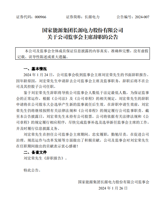 1月26日,長源電力發(fā)布公告稱,1月24日,公司監(jiān)事會(huì)收到監(jiān)事會(huì)主席劉宏榮先生的書面辭職報(bào)告。因年齡原因,劉宏榮先生申請辭去公司監(jiān)事會(huì)主席及監(jiān)事職務(wù),辭職后將不在公司及其控股子公司任職。