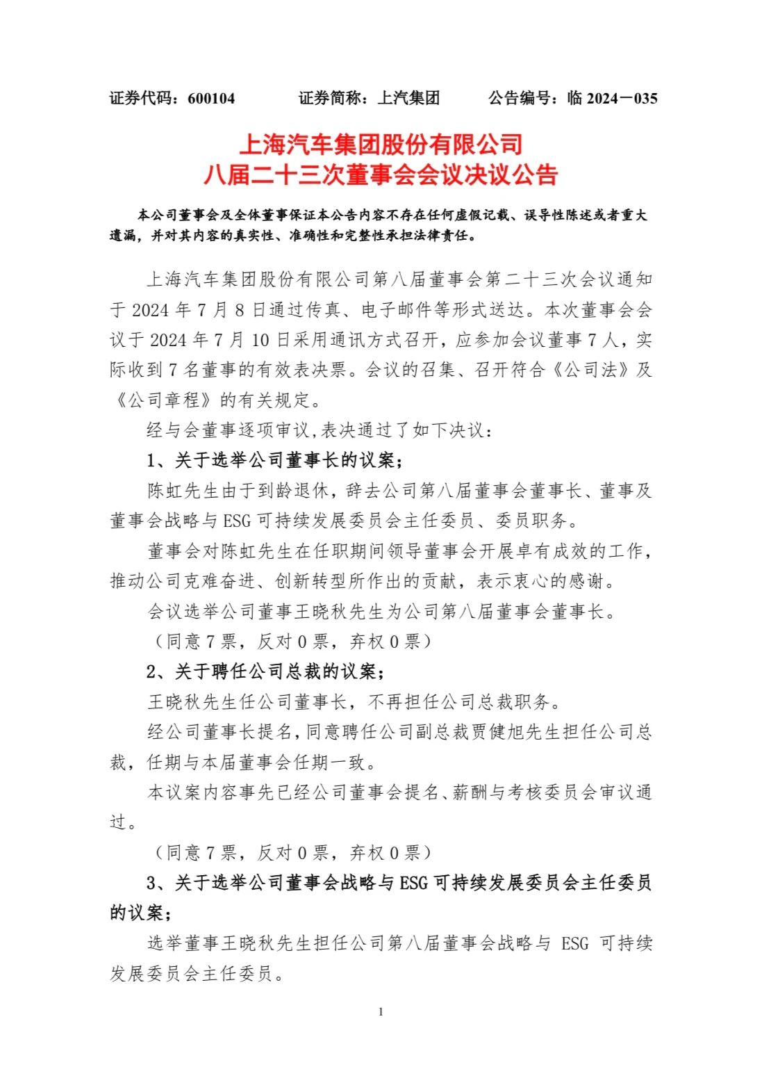 上海汽車集團(tuán)股份有限公司(以下簡稱“上汽集團(tuán)”)董事長陳虹因到齡退休辭去公司第八屆董事會董事長、董事及董事會戰(zhàn)略與ESG可持續(xù)發(fā)展委員會主任委員、委員職務(wù);王曉秋任第八屆董事會董事長。