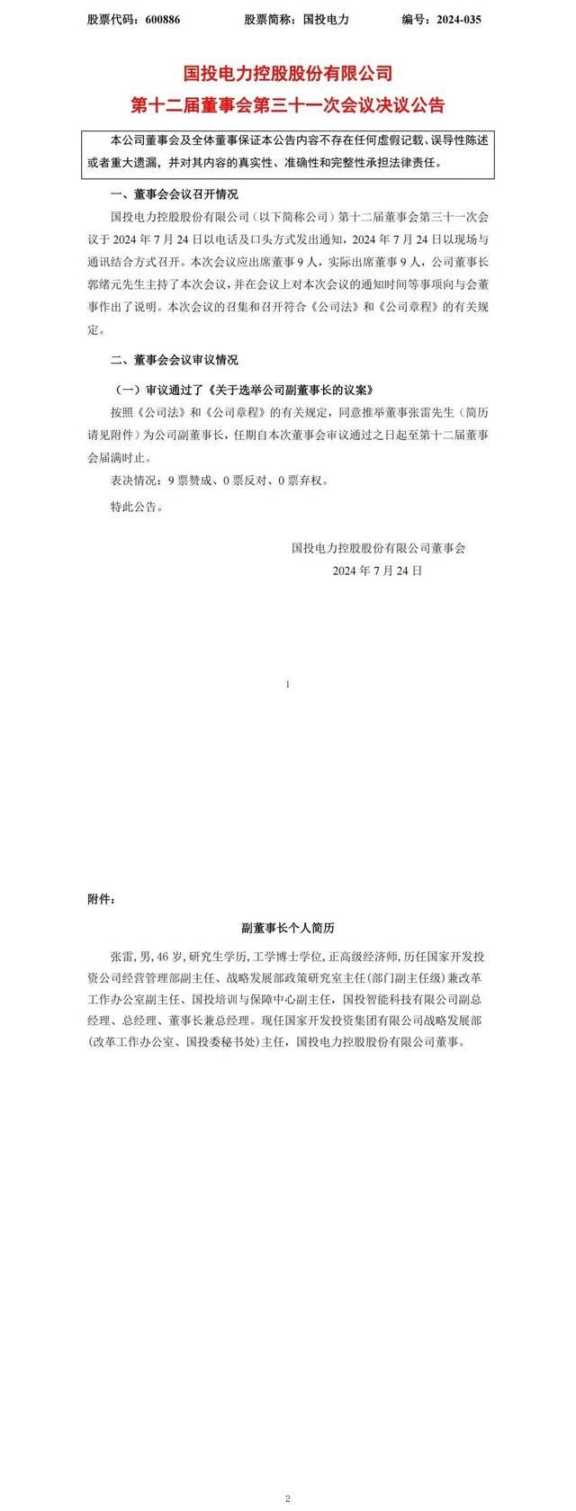 7月24日,國投電力發(fā)布公告,董事會(huì)審議通過了《關(guān)于選舉公司副董事長的議案》,同意推舉董事張雷先生為公司副董事長,任期自本次董事會(huì)審議通過之日起至第十二屆董事會(huì)屆滿時(shí)止。
