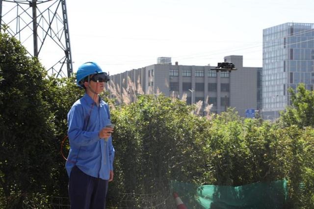 圖為工作人員應用飛行眼鏡操控無人機,對配電線路開展沉浸式巡線。