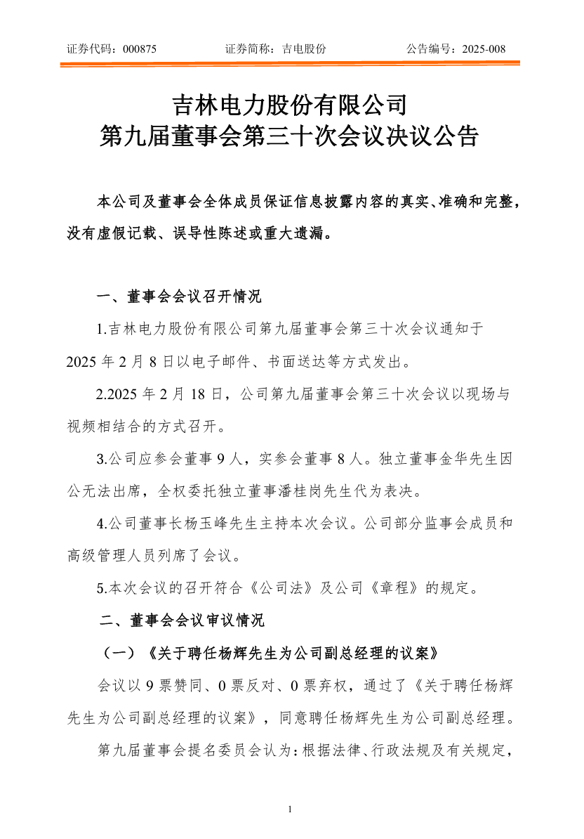 2月18日,吉電股份發(fā)布公告稱,公司第九屆董事會第三十次會議審議通過了《關于聘任楊輝先生為公司副總經理的議案》,同意聘任楊輝先生為公司副總經理。