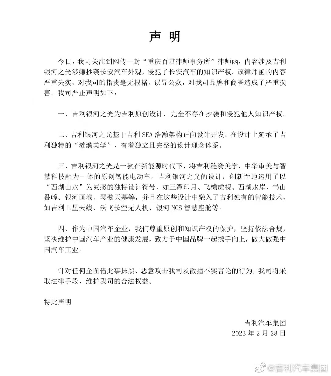 這封律師函曝光幾個(gè)小時(shí)之后,吉利汽車集團(tuán)就在官方微博發(fā)表了一份聲明。