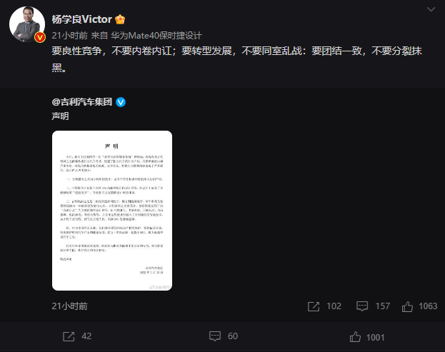 浙江吉利控股集團(tuán)高級(jí)副總裁楊學(xué)良隨后轉(zhuǎn)發(fā)了該聲明,并表達(dá)了個(gè)人觀點(diǎn),表示:要良性競(jìng)爭,不要內(nèi)卷內(nèi)訌;要轉(zhuǎn)型發(fā)展,不要同室亂戰(zhàn);要團(tuán)結(jié)一致,不要分裂抹黑。