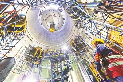 圖為示范工程首臺反應(yīng)堆壓力容器吊裝就位。