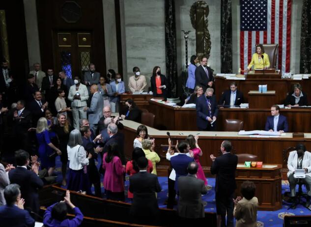 美眾議院通過(guò)《反通脹法案》現(xiàn)場(chǎng)。注意星條旗左側(cè)纏繞月桂葉的法西斯標(biāo)志浮雕