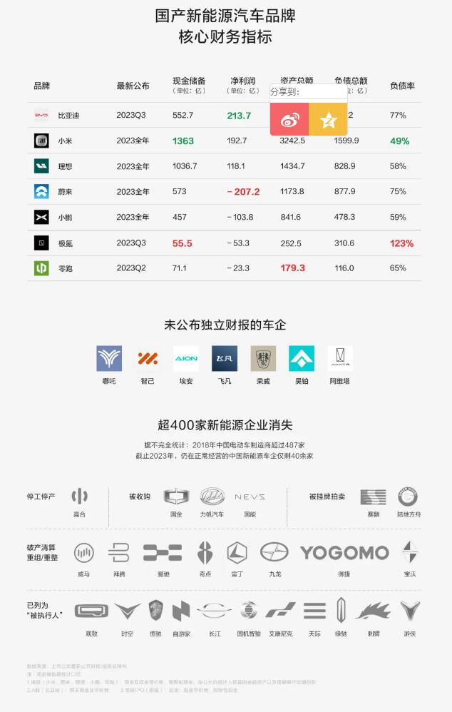 新進入場的小米堪稱科技富二代,根據(jù)剛剛披露的2023年財報,1363億元現(xiàn)金儲備不僅領(lǐng)銜國產(chǎn)新能源,更創(chuàng)下其自身的歷史新高。緊隨其后的是理想和比亞迪,值得一提的是,目前比亞迪、理想、小米是為數(shù)不多實現(xiàn)集團盈利的新能源品牌。其他品牌仍然難以逾越賠錢造車的紅線。