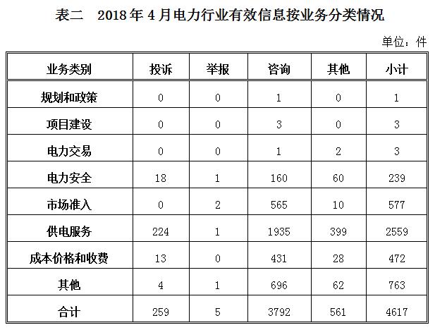 投訴舉報(bào)主要集中在電力行業(yè),共264件。從業(yè)務(wù)分類(lèi)情況看,電力安全方面19件,占7.20%;市場(chǎng)準(zhǔn)入方面2件,占0.76%;供電服務(wù)方面225件,占85.23%;成本價(jià)格和收費(fèi)方面13件,占4.92%;其他方面5件,占1.89%。(2018年4月電力行業(yè)有效信息按業(yè)務(wù)分類(lèi)情況見(jiàn)表二)