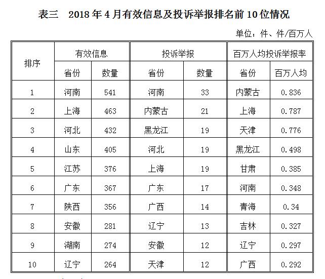 2018年4月,各?。ㄗ灾螀^(qū)、直轄市)按照有效信息數(shù)量排序,河南、上海、河北等?。ㄊ校┝腥珖?guó)前10位;按照投訴舉報(bào)數(shù)量排序,河南、內(nèi)蒙古、黑龍江等省(自治區(qū))排在全國(guó)前10位;按照百萬(wàn)人均投訴舉報(bào)率排序,內(nèi)蒙古、上海、天津等?。ㄊ小⒆灾螀^(qū))位于全國(guó)前10位。(2018年4月有效信息及投訴舉報(bào)排名前10位情況見(jiàn)表三)