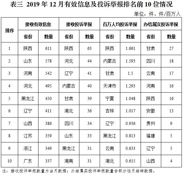 各?。ㄗ灾螀^(qū)、直轄市)按照收到的有效信息數(shù)量排序,陜西、山東、河南、河北、黑龍江等列全國前10位;按照投訴舉報(bào)數(shù)量排序,陜西、河北、遼寧、內(nèi)蒙古、甘肅等排在全國前10位;按照百萬人均投訴舉報(bào)數(shù)量排序,陜西,內(nèi)蒙古,甘肅,天津市,寧夏等排在全國前10位;按照辦結(jié)屬實(shí)投訴舉報(bào)數(shù)量排序,甘肅、四川、云南、河南、陜西等排在全國前10位。(2019年12月有效信息及投訴舉報(bào)排名前10位情況見表三)
