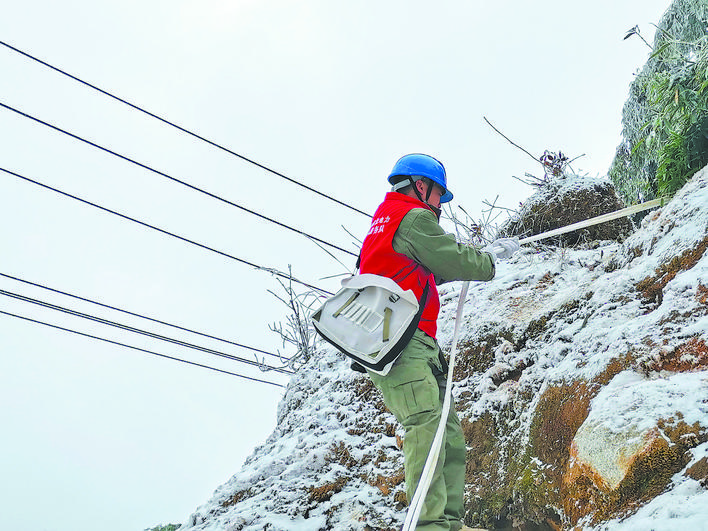 圖① 1月6日,國(guó)家電網(wǎng)湖南電力共產(chǎn)黨員服務(wù)隊(duì)在雪峰山觀冰站巡檢線路。 胡浩 攝
