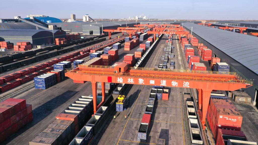 在榆林象道國際物流園集裝箱裝卸區(qū),工作人員在指揮裝卸外運煤炭(無人機照片)。新華社記者 陶明 攝