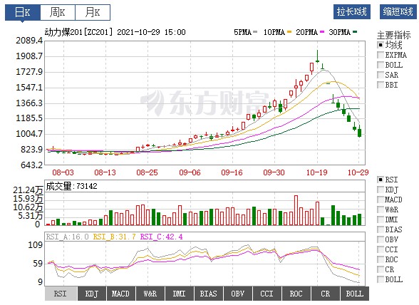 10月28日,受政策監(jiān)管沖擊,煤炭股市、期貨市場延續(xù)跌勢,煤炭概念跳水跌超6%,兗州煤業(yè)( 600188.SH )等多股跌停。商品期貨方面,動力煤跌2.25%,而在此之前的幾個(gè)交易日,以鄭商所動力煤為例,其價(jià)格直接攔腰斬?cái)?,?0月19日每噸1982元高點(diǎn)直落至10月28日夜間收市的1041元。
