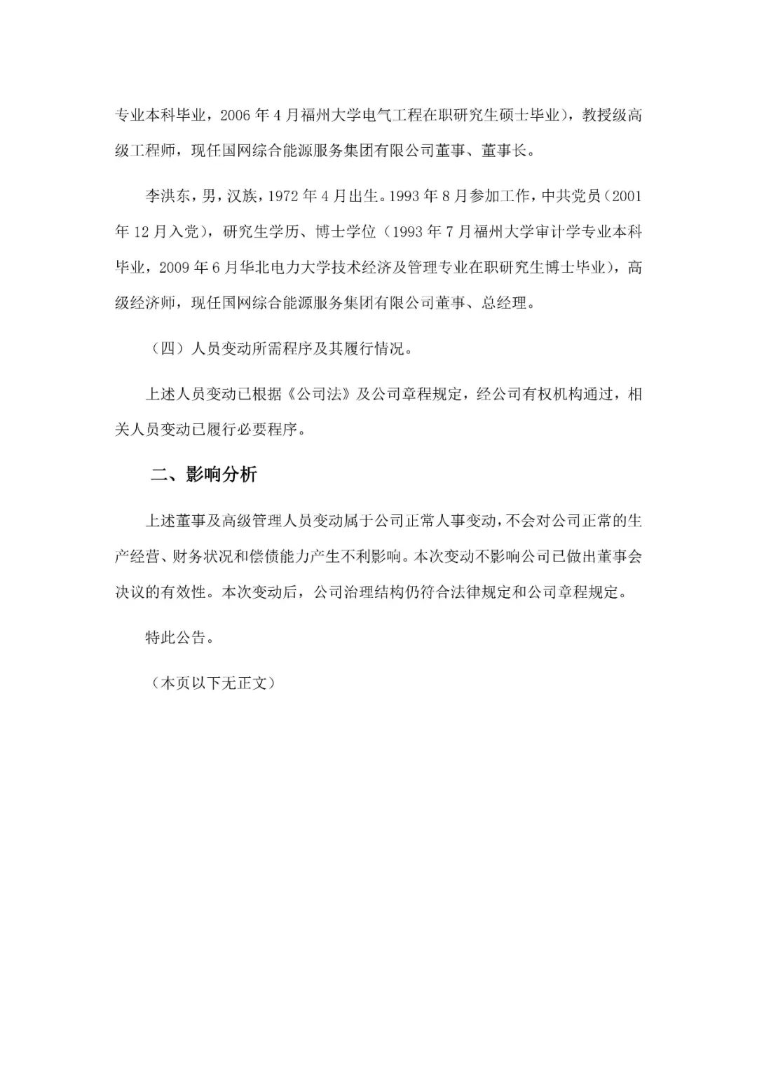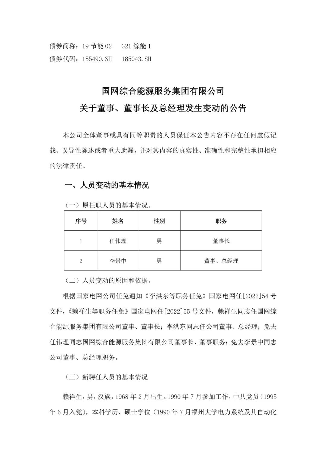 本網(wǎng)訊 4月13日,國網(wǎng)綜合能源服務集團有限公司發(fā)布關于董事、董事長及總經(jīng)理發(fā)生變動的公告。公告顯示,賴祥生同志任國網(wǎng)綜合能源服務集團有限公司董事、董事長;李洪東同志任公司董事、總經(jīng)理;免去任偉理同志國網(wǎng)綜合能源服務集團有限公司董事長、董事職務;免去李景中同志公司董事、總經(jīng)理職務。