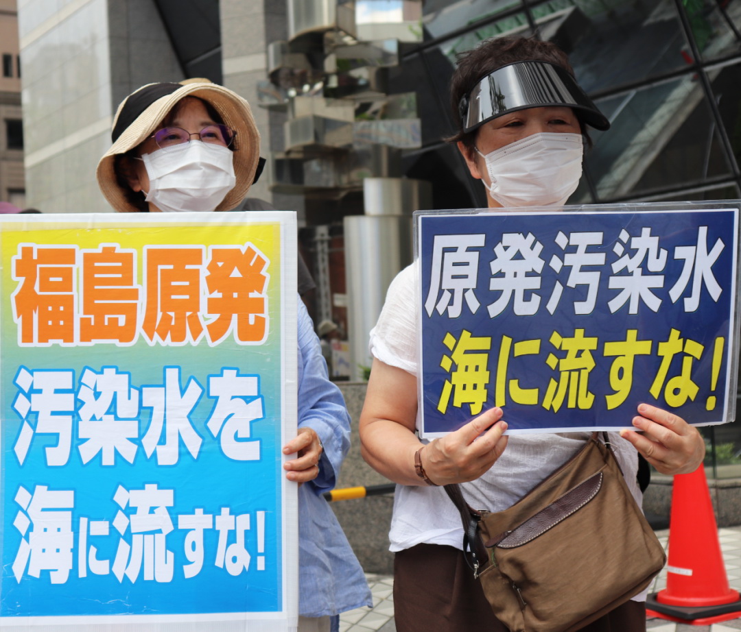 24日上午,上百名民眾在東電總部前緊急集會(huì),抗議日本政府和東電啟動(dòng)核污染水排海。