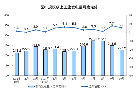 分品種看,10月份,火電、太陽能發(fā)電增速加快,水電增速回落,核電由增轉降,風電降幅擴大。其中,火電增長4.0%,增速比9月份加快1.7個百分點;水電增長21.8%,增速比9月份回落17.4個百分點;核電下降0.2%,9月份增速為6.7%;風電下降13.1%,降幅比9月份擴大11.5個百分點;太陽能發(fā)電增長15.3%,增速比9月份加快8.5個百分點。