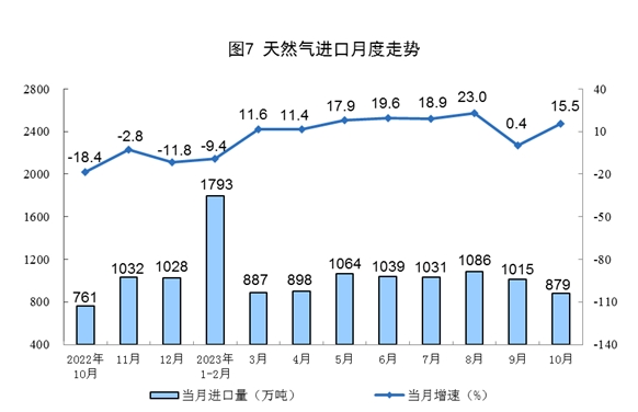 天然氣生產保持平穩(wěn),進口增速加快。10月份,生產天然氣190億立方米,同比增長2.6%,增速比9月份回落6.7個百分點,日均產量6.1億立方米。進口天然氣879萬噸,同比增長15.5%,增速比9月份加快15.1個百分點。