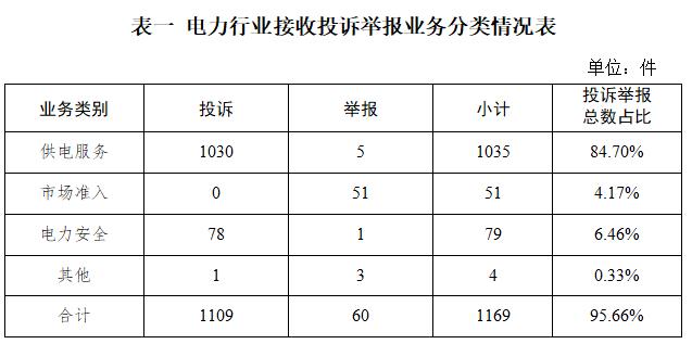 電力行業(yè)排在首位,數(shù)量為1169件、占投訴舉報總數(shù)的95.66%,主要集中在供電服務(wù)、電力安全、市場準(zhǔn)入等方面。