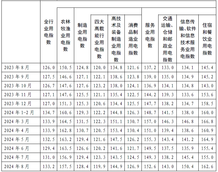 2024年8月,全行業(yè)用電指數(shù)為133.2,全行業(yè)用電量比2020年基期增長了33.2%,年均增長7.4%,同比增長5.7%,全行業(yè)用電量保持平穩(wěn)增長。