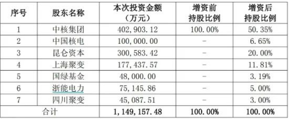 相關(guān)信息顯示中核集團(tuán)、中國(guó)核電、浙能電力、中國(guó)石油集團(tuán)昆侖資本有限公司、上海未來聚變能源科技有限公司、國(guó)家綠色發(fā)展基金股份有限公司及四川重科聚變能源科技有限公司,以1.0019元/注冊(cè)資本的價(jià)格,共同向中國(guó)聚變能源有限公司投資約114.92億元,認(rèn)購(gòu)聚變公司新增注冊(cè)資本114.69億元。其中,中核集團(tuán)本輪出資40.29億元,增資后持有中國(guó)聚變公司50.35%股份。中國(guó)核電投資金額為10億元,持有聚變公司6.65%股權(quán);浙能電力出資約7.51億元,持有聚變公司5%股權(quán)。此外,中石油旗下昆侖資本此次投資約30.06億元,獲得中國(guó)聚變公司20%股份,成為第二大股東,本次增資完成后,聚變公司的注冊(cè)資本為150億元,具體股權(quán)結(jié)構(gòu)如下: