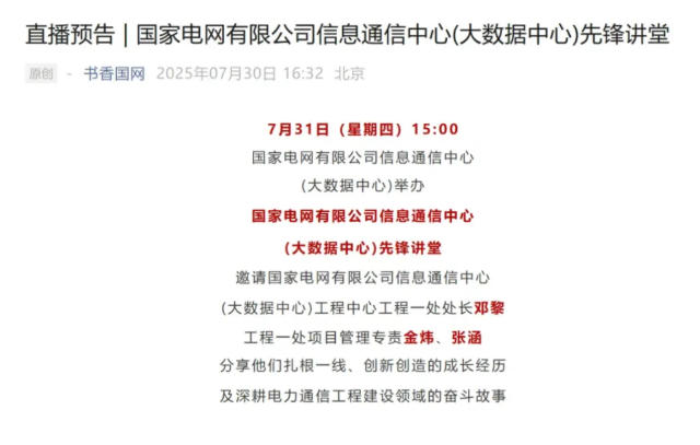 7月30日《書香國網(wǎng)》公眾號(hào)先鋒講堂直播預(yù)告推文顯示,國家電網(wǎng)有限公司信息通信中心(大數(shù)據(jù)中心)這一機(jī)構(gòu)名稱首次出現(xiàn)。