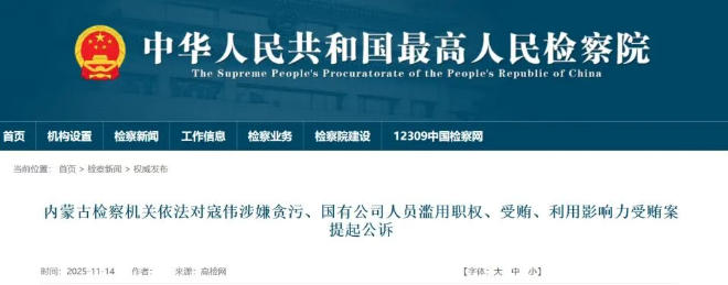 中國大唐集團有限公司原黨組副書記、總經(jīng)理寇偉涉嫌貪污、國有公司人員濫用職權、受賄、利用影響力受賄一案,由國家監(jiān)察委員會調(diào)查終結,移送檢察機關審查起訴。最高人民檢察院依法以涉嫌貪污罪、國有公司人員濫用職權罪、受賄罪、利用影響力受賄罪對寇偉作出逮捕決定,并指定由內(nèi)蒙古自治區(qū)人民檢察院興安盟分院審查起訴。近日,內(nèi)蒙古自治區(qū)人民檢察院興安盟分院已向內(nèi)蒙古自治區(qū)興安盟中級人民法院提起公訴。