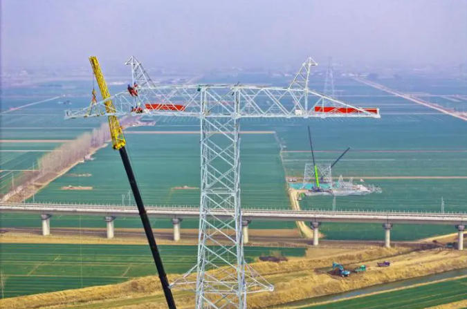 ▲國網(wǎng)湖北襄陽供電公司員工在220千伏楚襄線開展立塔作業(yè),為鋰電池新能源項目建成提供電力保障